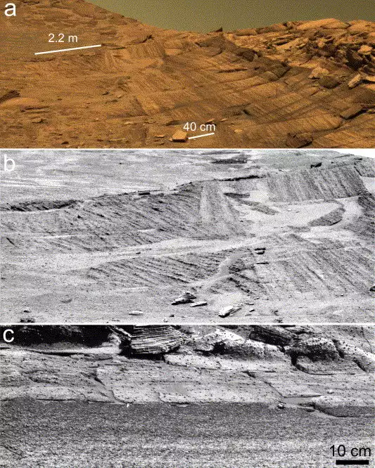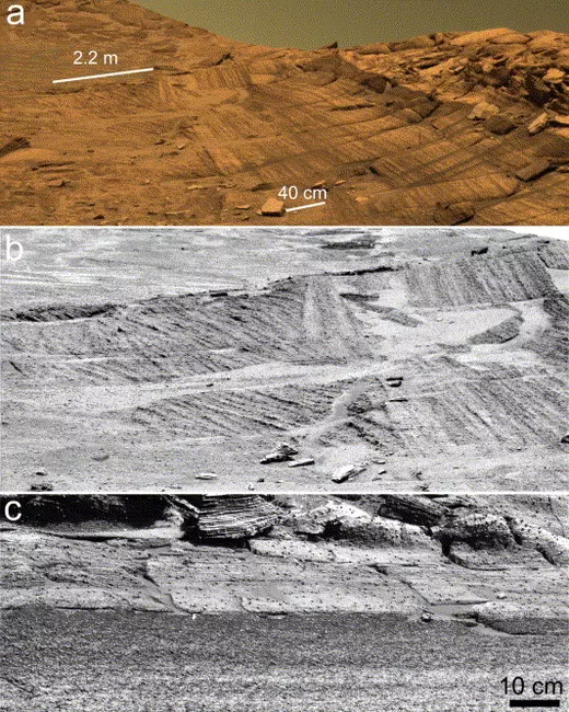 Figure 3 Burns Formation: Contacts between stratigraphic units of the Burns formation as obtained by the Pancam at Burns cliff, Endurance crater. (a) Burns formation