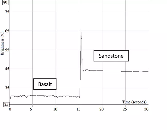 View Original Image at Full SizeBrightness graph for the basalt and sandstone derived from the Light Grapher software. Note that the brightness of the basalt is lower than the sandstone and the peak in brightness at ~15 sec is from the change from basalt to sandstone (no rock in field of view).