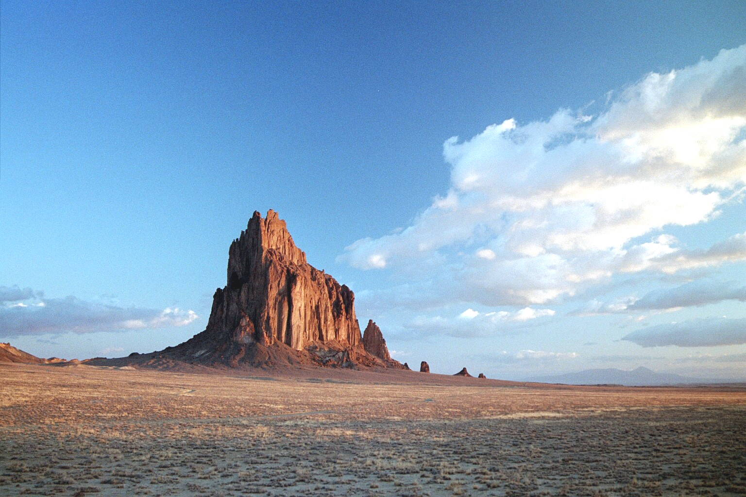 Tsé bit'a'í ("Rock with Wings") or Ship Rock, a 550-m exhumed diatreme and dike complex in the mid-Tertiary Navajo Volcanic Field. It is a prominent landform in the northeastern Navajo Nation.