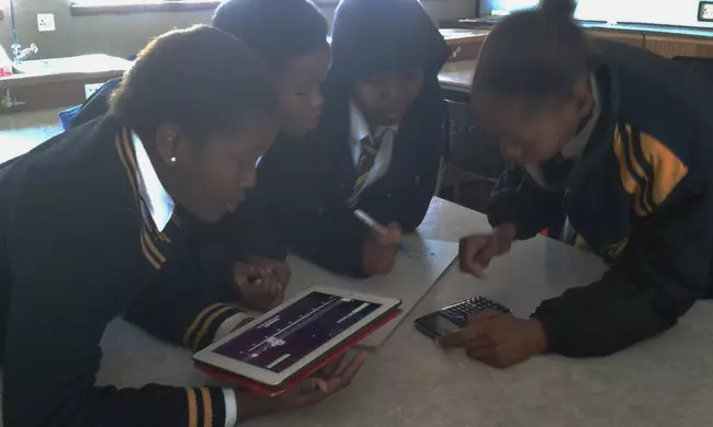 View Original Image at Full SizeStudents at Ntemoseng Secondary school in Botshabelo explore physics using a Direct Measurement Video. Image by Angela Stott Vogt.