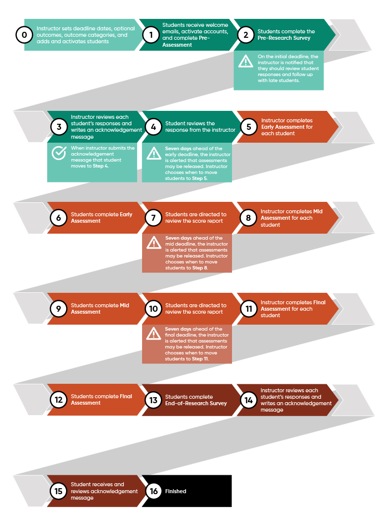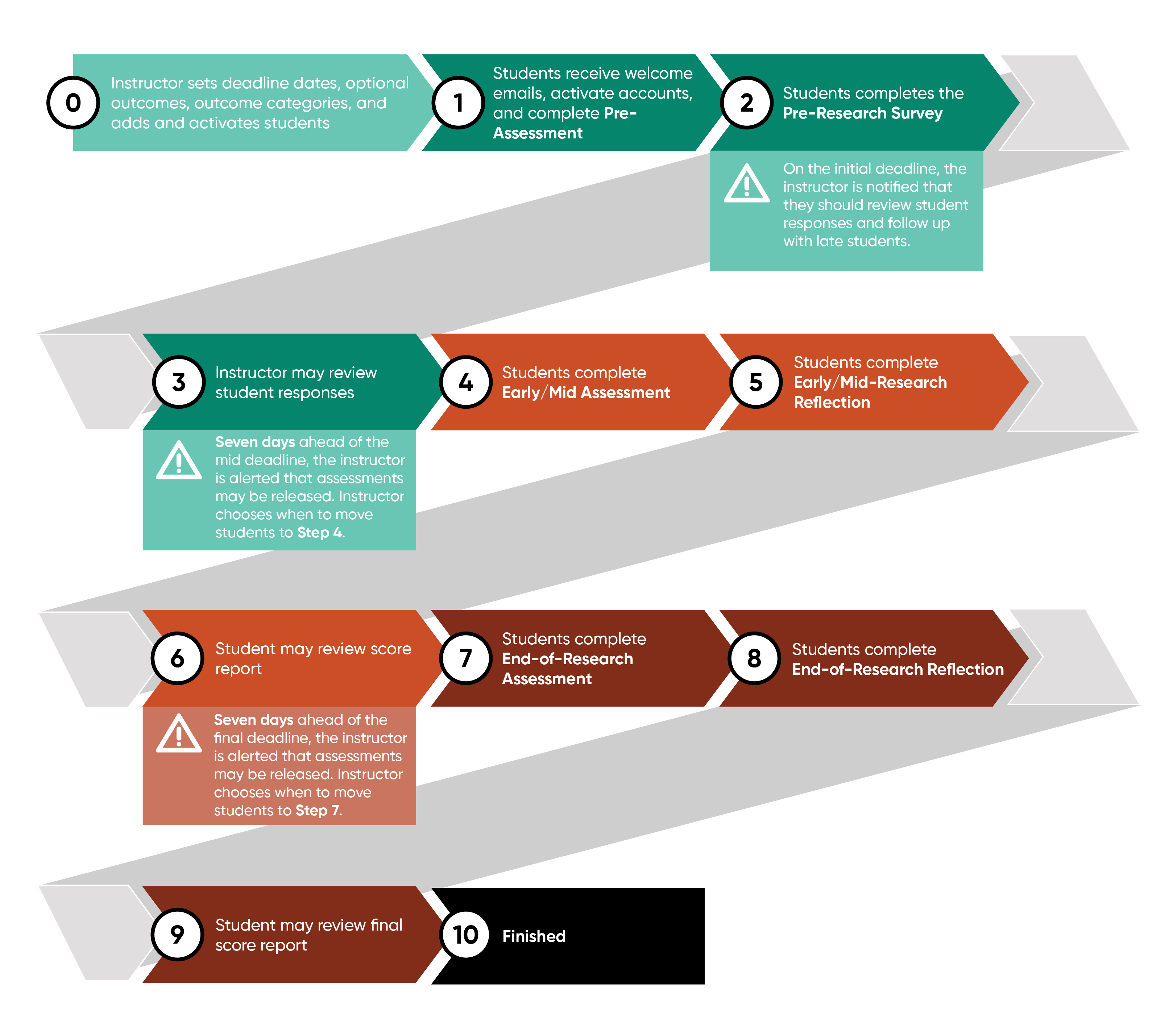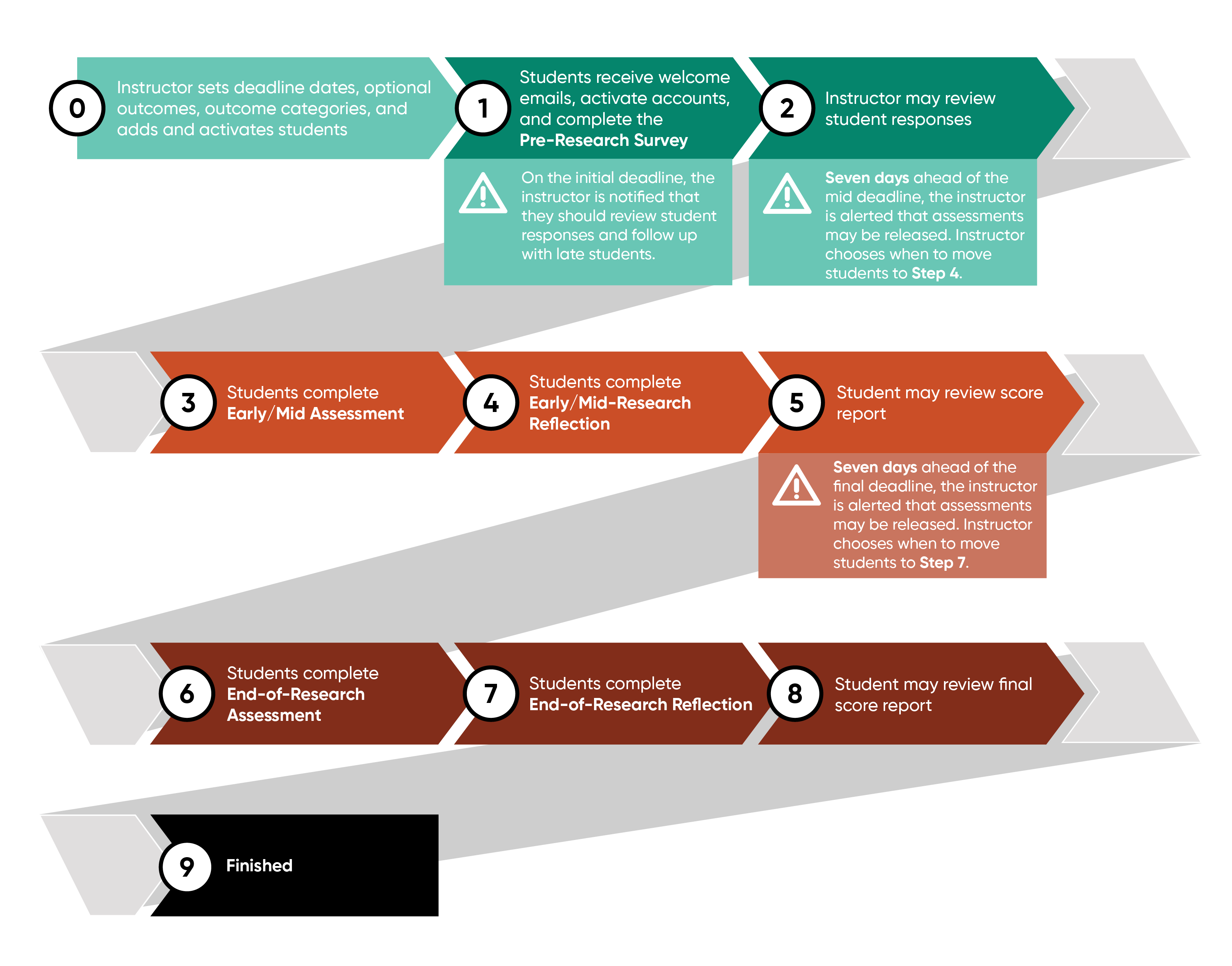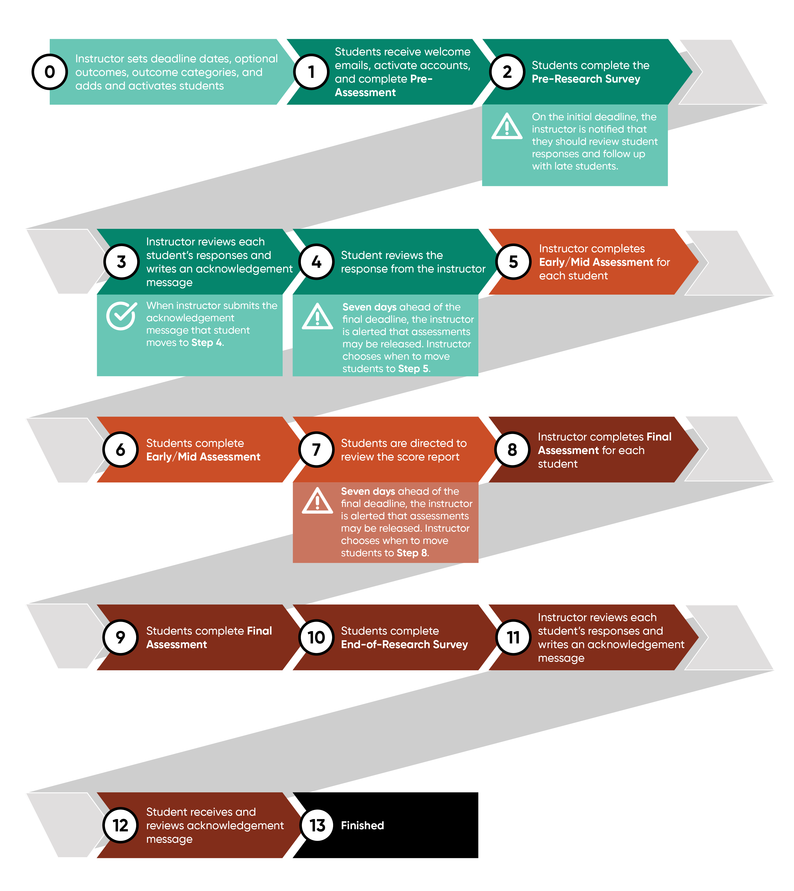 - Students receive automated emails instructing them to set up an account and complete both the Pre-Research Assessment, which includes the set of outcome categories selected by the instructor, and the Pre-Research Open-Ended Questions.