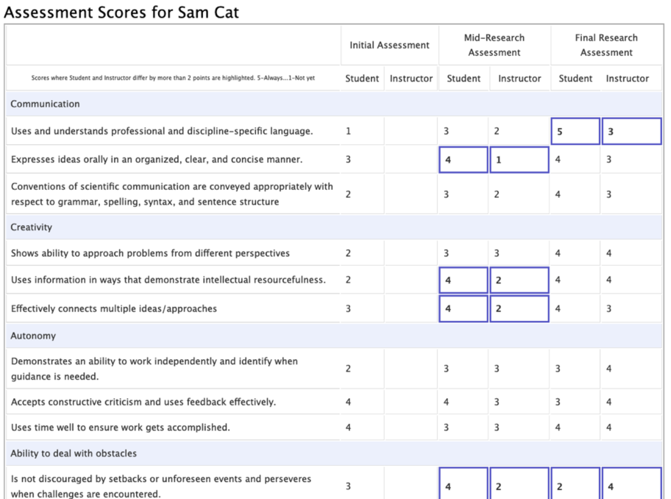 The statistical mean refers to the average for the data and is determined by adding all the assessment score points assigned to a given population of students and then dividing that total by the total number of students. It is not unusual for students to tend to score themselves higher at the initial assessment and then to adjust (decrease) their score on many of the items at the early/mid research assessment when they know more about the research and what they are capable of, and then score themselves higher at the final assessment because they have gained appreciable skills. This is common in student pre-mid-post self-assessments. The Dunning-Kruger effect is a psychology term to describe the cognitive bias in which people incorrectly overestimate their knowledge or ability in a specific area. This tends to occur because a lack of self-awareness prevents them from accurately assessing their own skills. This effect and resulting score pattern is a hallmark of metacognitive growth and is demonstrated with a curvilinear (U-shaped) growth line. As the student becomes more self-aware they adjust their scores downward because they recognize their lack of knowledge / experience and then proceed to resolve the deficit as shown in the final score.