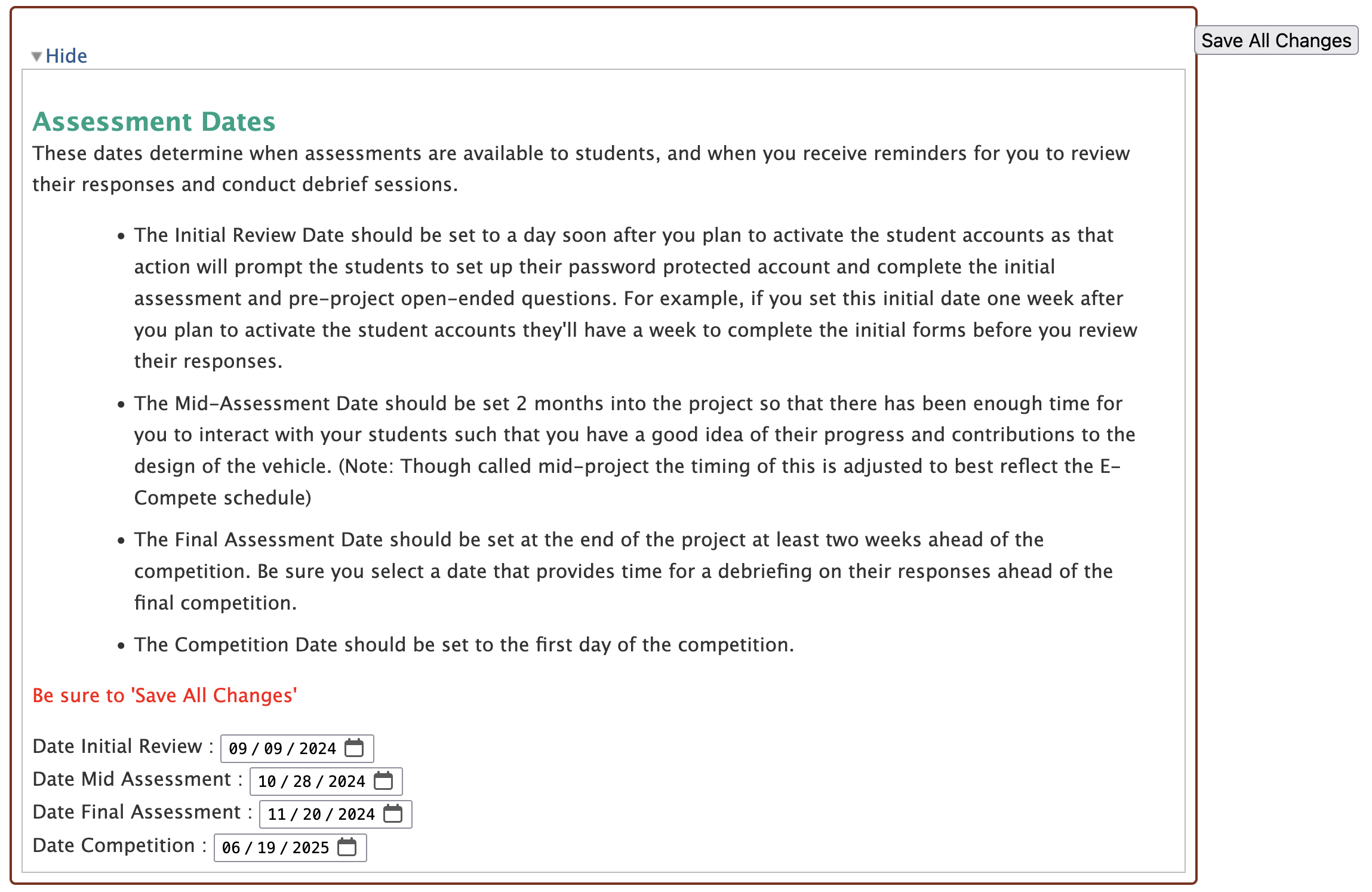 The dashboard will read "Waiting for release of End-of-Project Assessment" during this step. You do not need to start the Early/Mid-Project Assessment until the intended time in your project. You will be reminded by email as that date approaches. During this time, it is recommended to meet with students to discuss their responses to the Early/Mid-Project Assessment.