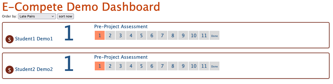 Steps 1 to 3 should be completed for each student before the project begins. The current step will be highlighted in orange and indicated by number in the block for each student. By clicking on the block, you will be able to expand the view to see when each step was completed.