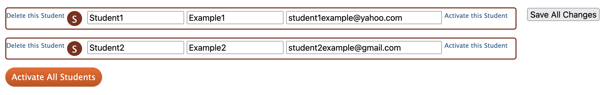 Whether you are initially setting up the dashboard, or adding a student after the start date, you will need to activate each student when you want the E-Internship process to begin. Each student you have entered will appear in a block with name and email address once you have selected "Save all Changes." When ready to begin the E-Internship program, you can activate each student individually by selecting "Activate this Student" at the bottom of the block OR you can activate all the students you have set up at once using the "Activate all Students" button below all your un-activated students.
