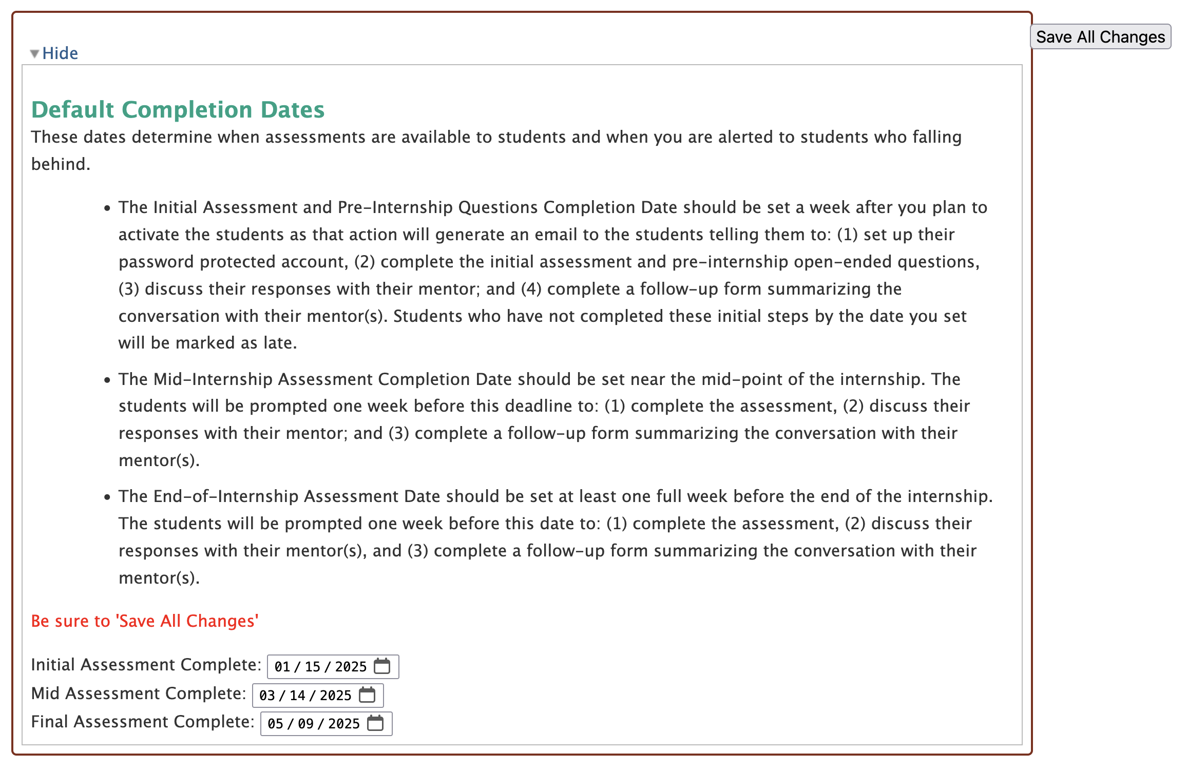 - Mid-Internship (Steps 5-9 on the Dashboard): The student will evaluate their progress halfway through their internship.