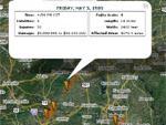 This website catalogs all the tornado paths in the United States since 1950. The tornado path data is overlaid onto a Google Maps base for easy browsing and manipulation of the map view. Clicking on individual tornados provides the user with information such as its Fujita rating, the amount of damage caused by the tornado, the size of the path that the tornado made, and the length of time the tornado was on the ground.