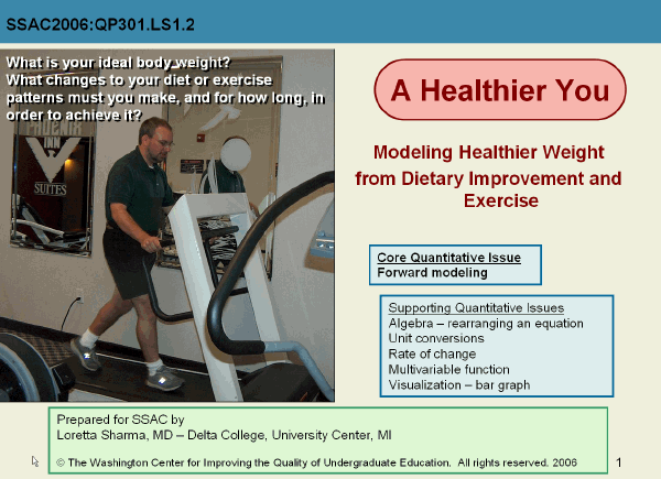 In this Spreadsheets Across the Curriculum module, students develop an Excel spreadsheet to calculate how many days it would take for an overweight person to come down to a healthy weight. The context is a community weight-loss program, and the presumption is that the student is designing a weight loss plan for the participants in the program. The weight-loss plan incorporates the effect of both dietary changes and increases in activity. The student's spreadsheet takes into account information relating to age, sex, height, weight, body mass index, resting energy expenditure, caloric content of food, and metabolic equivalents.