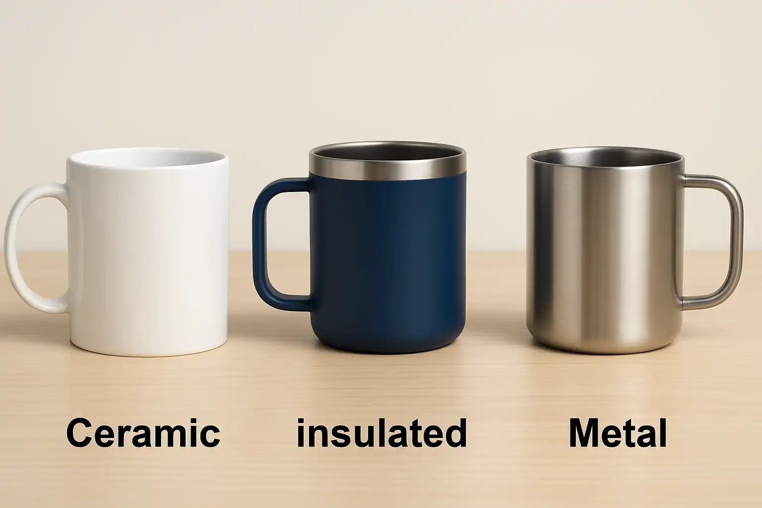 An illustration showing ceramic, metal, and insulated mugs to aid visualization. Helps connect computation to physical intuition and supports inclusive visual learning.